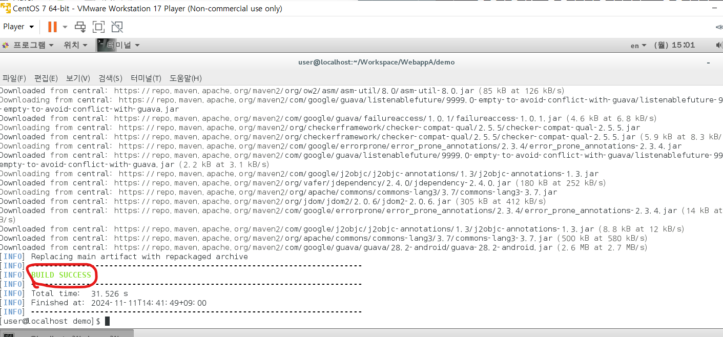 메이븐 빌드 성공결과 CentOS 7 WAS 출력로그
